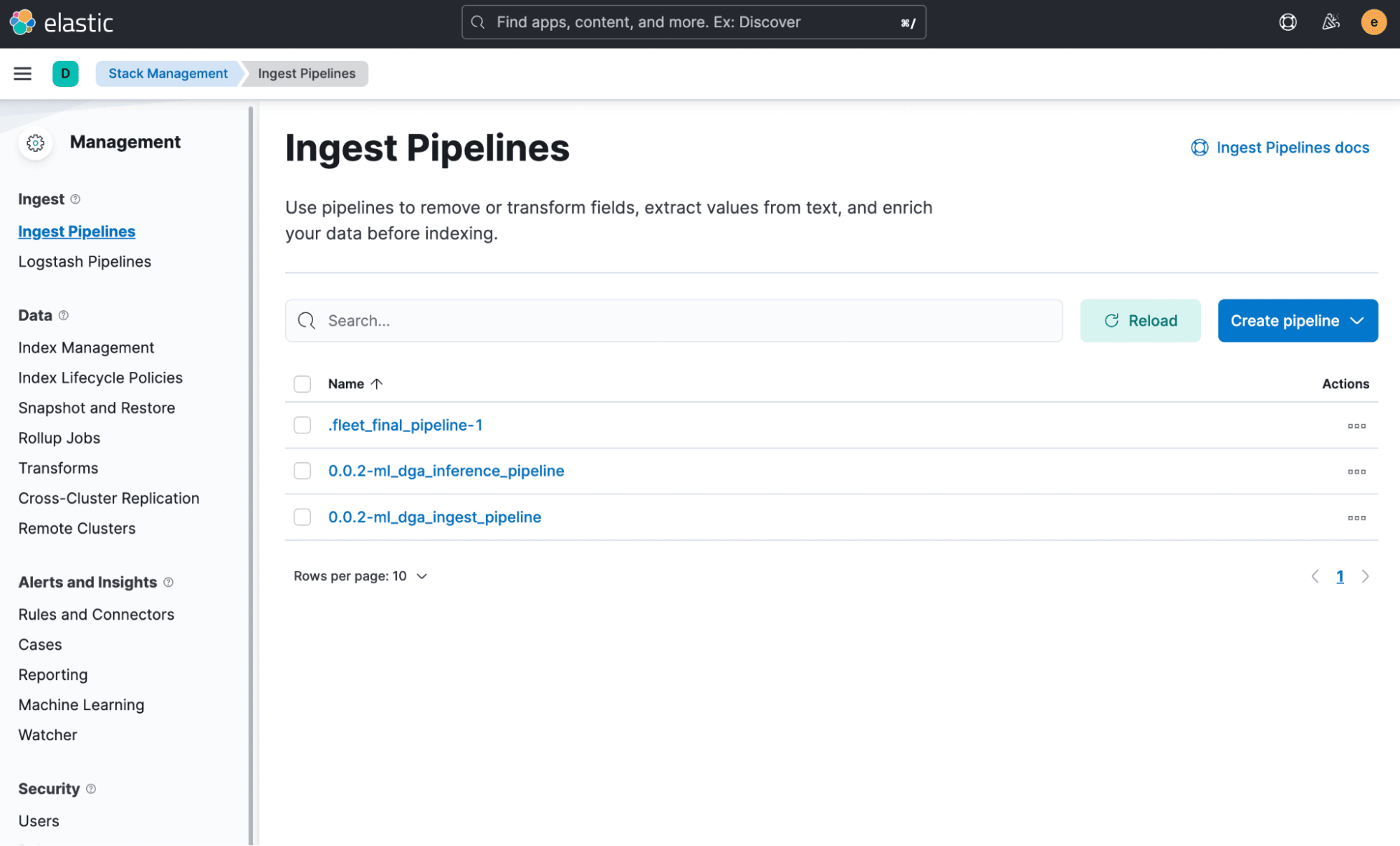 Once installation is complete, you can navigate to Stack Management > Ingest Pipelines and see that the <version-number>-ml\_dga\_ingest\_pipeline has been installed and can now be used to enrich incoming ingest data. The ingest pipeline leverages the <version-number>-ml\_dga\_inference\_pipeline to do this.