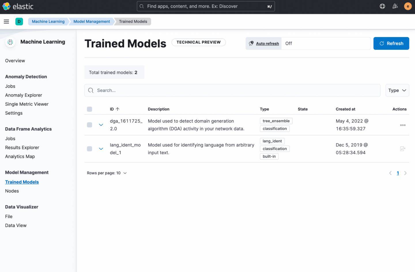 Similarly, the installed DGA model can now be seen in Machine Learning > Model Management > Trained Models.