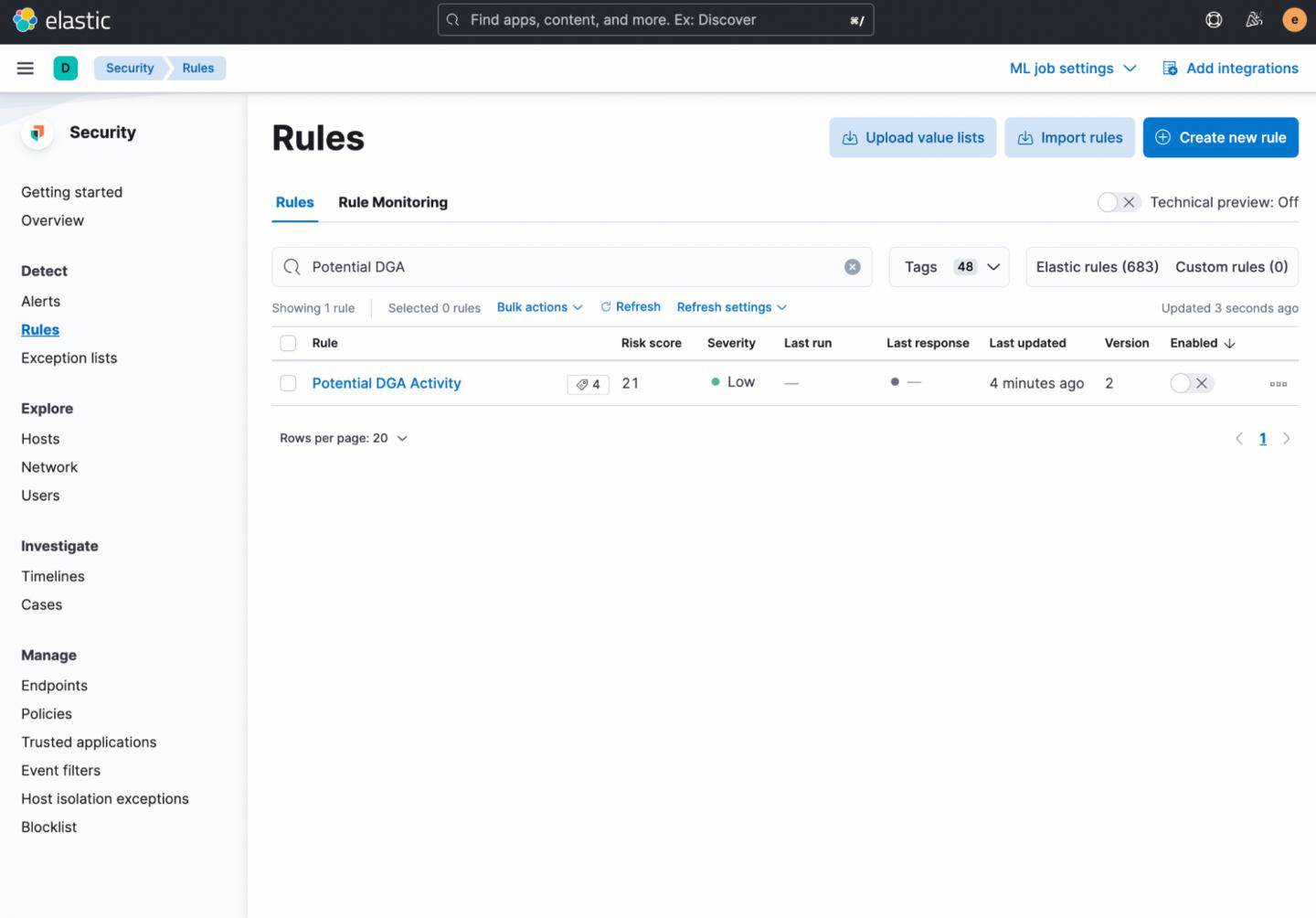 To maximize the benefit of the DGA framework, activate the installed detection rules. They are triggered when certain conditions for the supervised model or anomaly detection job are satisfied. The complete list of the installed rules can be found in the Overview page of the package itself or in the latest experimental detections release.