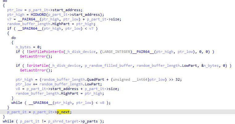 The NTFS/FAT boot sector and random file physical offsets are enumerated for each accessible physical drive, and then overwritten by the output of the CryptGenRandom API function and a series of FSCTL_GET_RETRIEVAL_POINTERS and FSCTL_MOVE_FILE IOCTLs.