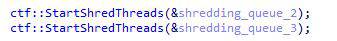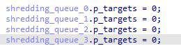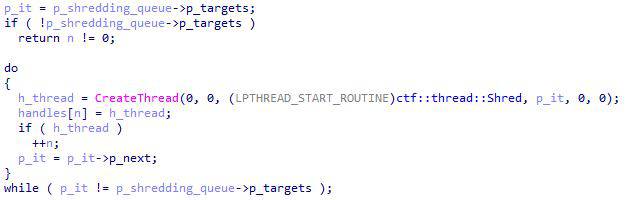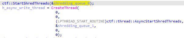 Each queue usage and its functionality is undetermined, but are used at different points in the sample. The shredding queue is composed of a linked list of targets which contain random pre-generated data (generated at queuing) of the size of the target, the disk number and a linked list of “file” parts with disk addresses and sizes.