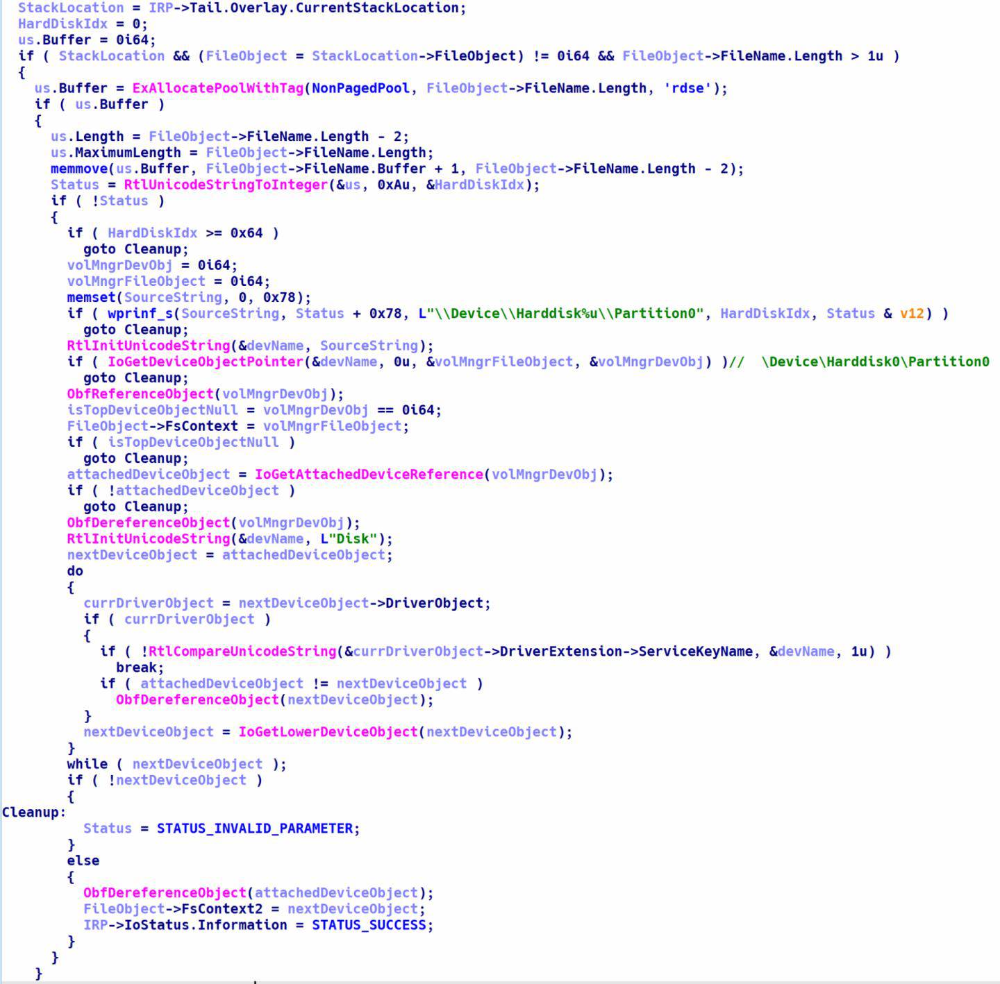 Looking at the dispatch function that handles the IRP_MJ_CREATE requests, we can see that the driver builds the name of the symlink \Device\HarddiskX\Partition0 and saves a pointer to its file object on the driver’s file object fs context. The driver then uses the volume manager device object to obtain a pointer to the highest level device object in the disk device stack.