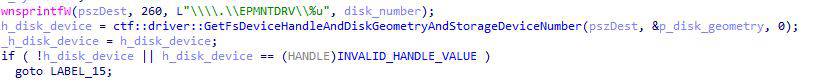 The malware interacts with the IOCTL interface, passing the parameter IOCTL_VOLUME_GET_VOLUME_DISK_EXTENTS with a value of 0x560000 to the device driver in order to retrieve the physical location of the root driver (\.\C). The root drive corresponds to the volume Windows uses to boot, and its identification is essential to achieve a destructive impact.