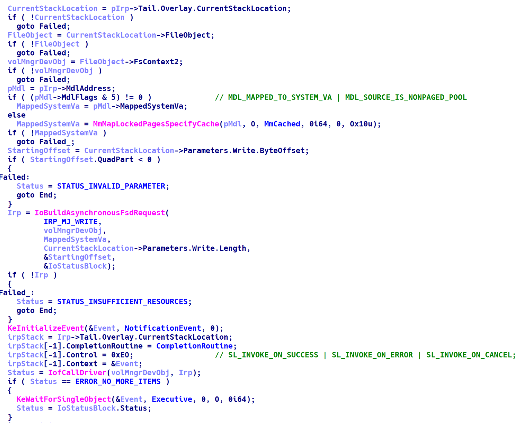 Moving to the function that handles the write requests, we can see that it builds an asynchronous Input Output Request Packet (IRP), which is an API used for drivers to communicate with each other, and forwards it the volume manager device. The buffer used in the IRP is described by the Memory Descriptor List (MDL) driver function. Finally, a completion routine is provided that will free the MDL and release memory used by the IRP.