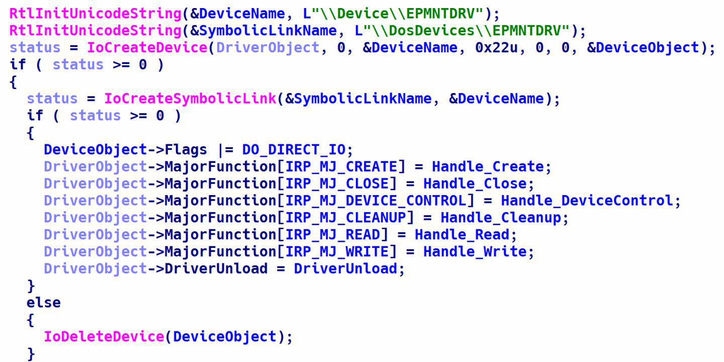 When the driver is loaded, it creates a device named \Device\EPMNTDRV and creates a symbolic link to be exposed to user mode. Then, it initializes the driver object with the following entry points.