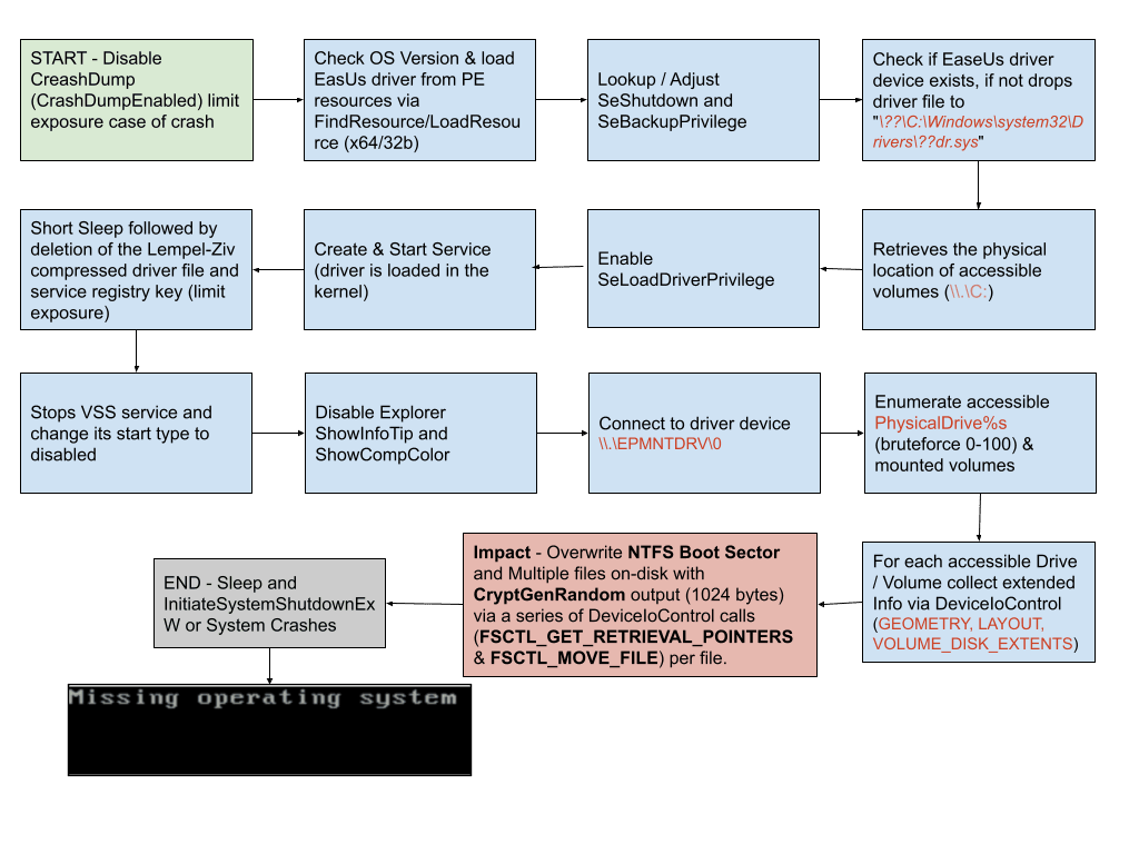 The driver that is loaded by the user mode component is quite similar to the driver that belongs to Eldos Rawdisk and has been leveraged previously by threat actors like Shamoon and Lazarus. The difference is that HERMETICWIPER abuses a driver (epmntdrv.sys) that belongs to EaseUS Partition Master, a legitimate disk partitioning software.
